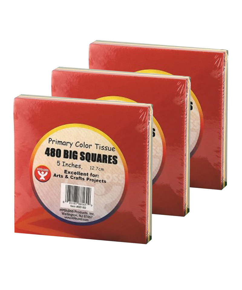 Tissue paper squares are colorful and loaded with usability, great for bulletin boards, mobiles, and classroom decorations. They come in an economy pack of 480 squares in primary colors. Sold as 3 packs for a total of 1440 squares.