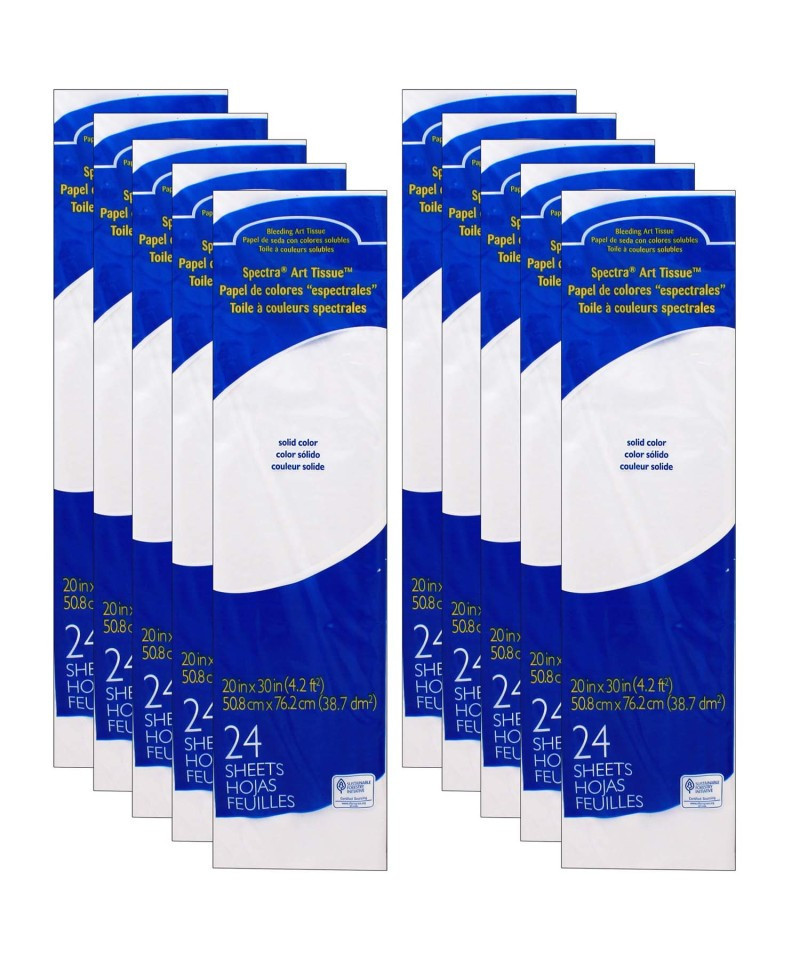 Spectra® Deluxe Bleeding Art Tissue™ is a fine-quality deluxe-grade tissue that bleeds, making it easy to create arts and crafts projects with a beautiful watercolor look. Rich, vibrant colors blend when moistened to create exciting artistic effects. Wet with a brush and wash beautiful, translucent color on to the paper. Overlap two colors and watch them blend. Or, add glue to the water to hold specific shapes in place and create magnificent, multi-layered effects. The high-quality tissue can withstand cutting, crinkling and folding without tearing. Sheets measures 20" x 30". Each pack includes 24 sheets. Sold as 10 packs for a total of 240 sheets.