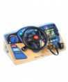 - Realistic play steering wheel mounted on a sturdy wooden dashboard with lights, sound effects, and moving parts, including a scrolling GPS
