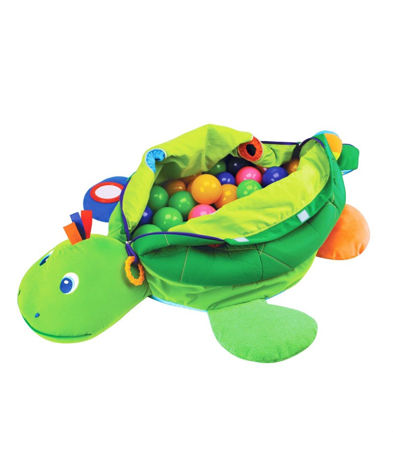 Kids will have a ball with this crinkling, jingling, multi-textured toy! The giant, friendly turtle comes filled with 60 squeezable multi-colored balls that are easy to grasp, toss, and roll. Zipper and self-stick tabs open so baby can sit inside, and close to store balls and to make a fun pillow. Features include holes to push and pull balls through, a non-slip bottom, crinkling feet, squeaking button, textured ring, mirror, silky fabric tags, and attached soft ball rattle.