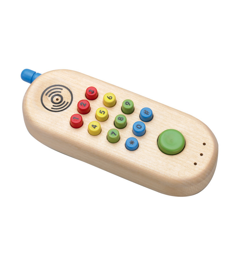 This highly crafted wood - realistic first cell phone toy, will provide the young caller with hours of imaginative play. The cell phone has a built in ringing sound when the green button is pushed. All multi colored numbers all depress into the phone. Measures 6"L x 2"W.