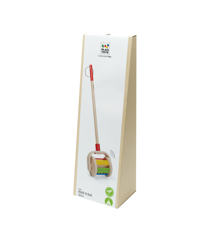 The PlanToys Walk N Roll Wooden Push & Pull Toy makes learning to walk an exciting adventure for newly-mobile toddlers. As little ones push it across the floor, the wheels turn and wooden balls inside strike the panels, creating cheerful jingling sounds that encourage continued movement. This engaging toy helps children develop gross motor skills, hand-eye coordination, and physical strength, while also building confidence as they master walking on their own. Sustainably crafted in Thailand from reclaimed rubberwood, formaldehyde-free glue, organic pigments, and water-based dyes in a green energy-powered facility, the Walk N Roll is a safe and eco-friendly choice for active play.