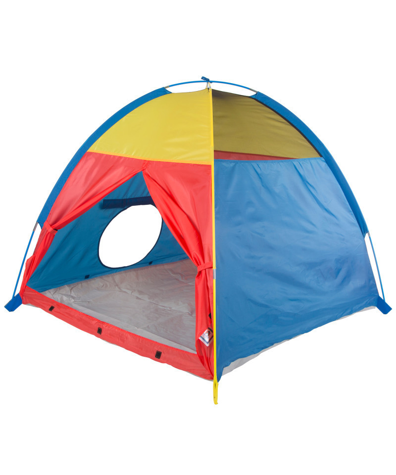 Not all tents are created equal. This primary colored Polyester Taffeta tent is so durable it can be used indoors or outdoors. Use it alone or combine it with the "Find-Me" connecting tunnel (sold separately). Connect several tunnels and tents together to create a whole city. Tent comes with "mesh" ventilation panels at the top for airflow on hot days as well as for easy viewing. Durable, washable floor made of polyethylene keeps spills from ruining the carpet and it keeps you dry from the wet grass. Great fun for an outdoor backyard. Measures 48" x 48" x 42".