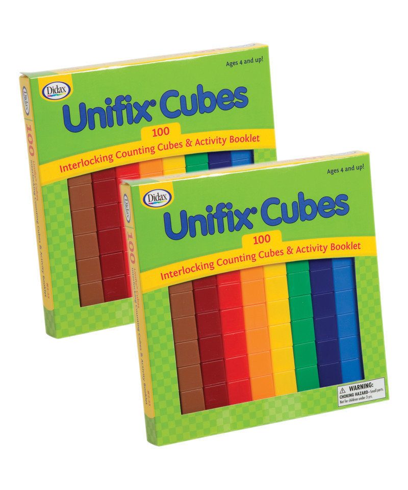 Unifix Cubes are perfect for teaching young learners patterns, numeration, operations, place value and early fractions. Each pack includes 100 Unifix Cubes in 10 standard colors: red, dark blue, light blue, yellow, green, orange, maroon, brown, black and white. This is a great starter set to introduce the world of Unifix Cubes, the industry's Gold Standard in math manipulatives! Sold as 2 packs for a total of 200 Unifix Cubes.
