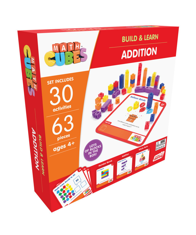 Mathcubes - Addition brings the concept of basic arithmetic to life for children aged 4 and up. With 63 specially designed pieces, including our signature Mathcubes and innovative hinges, this set lets young learners visualize and understand the relationships between numbers. The kit also features 30 engaging activities across 15 double-sided cards, providing a structured pathway to mastering addition skills.