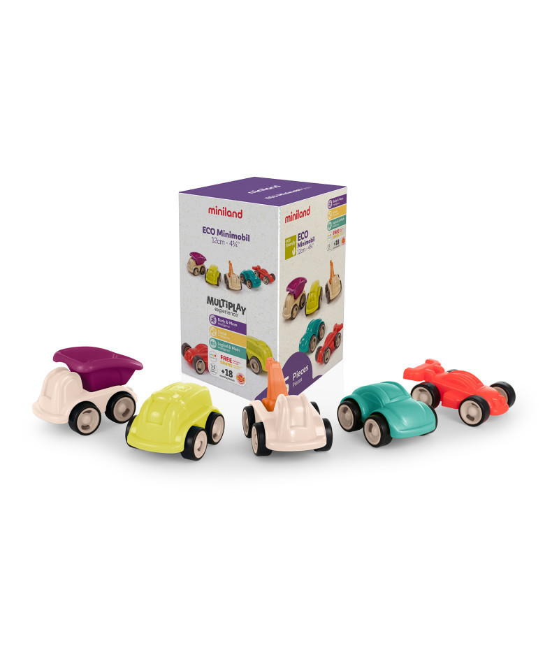 Miniland's classic Minimobils, now manufactured in eco-friendly materials to reduce their environmental impact. These fun didactic toys stimulate learning about the physical and social environment and can serve as support in the first steps towards Road Safety Education. A robust and durable design, with very safe non-removable wheels and high-strength axels. Set of 5.