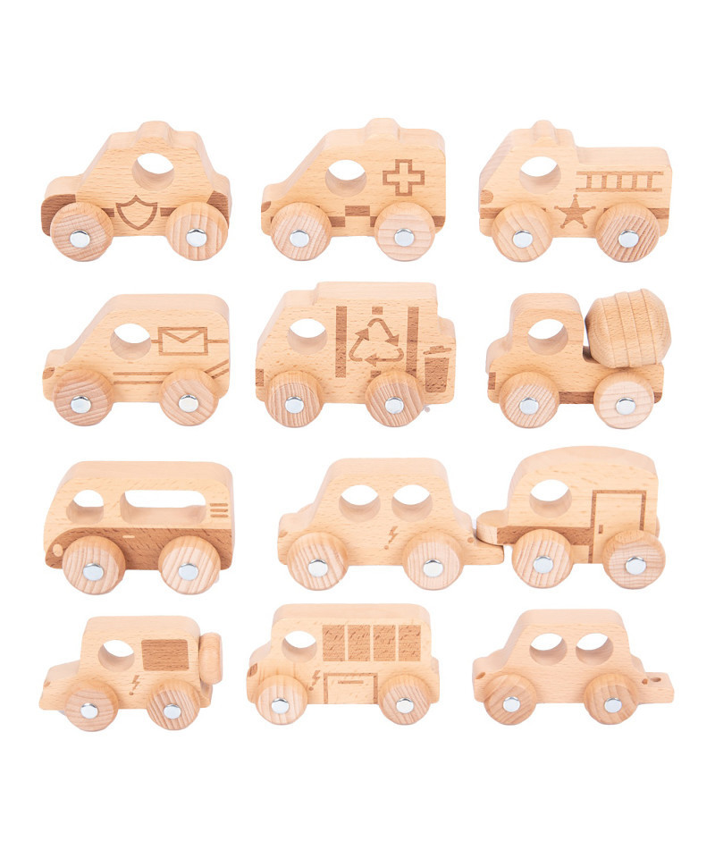 - 12 VEHICLES -- This set includes 12 solid, beechwood vehicles with rotating wheels. Use this wooden toy set in small-world or imaginative play. And learn about travel and community services.