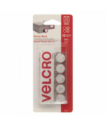 VELCRO® Brand Sticky Back hook and loop fasteners are ideal for smooth surfaces and can be used for indoor or outdoor applications. VELCRO® Sticky Back Tape can be trimmed into strips of different lengths with a pair of household scissors. Package contains 15 - 5/8" coin shaped tabs. Sold as 6 packs, 90 pieces total.