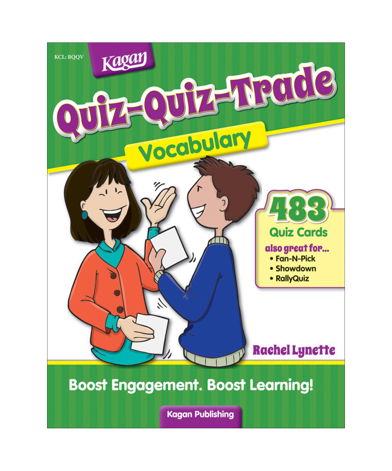 Quiz-Quiz-Trade is a student favorite! This Kagan Structure turns need-to-know curriculum into a fun and interactive quizzing game. To play, every student receives a quiz card relating to the topic. Students then pair up with a classmate. Using their cards, they quiz each other. After coaching or praising, they trade cards and set off to quiz a new classmate with their new card. The repeated practice boosts retention of the content. Memorizing important information and concepts has never been so fun! Each book is loaded with card sets on a variety of topics. Each card set includes enough ready-to-copy cards for your entire class to play. 192 pages.