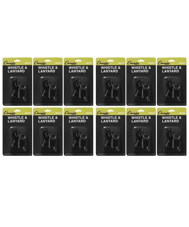 The Champion Sports Whistle and Lanyard Combo includes a heavy-duty nylon lanyard with a medium weight plastic whistle. Ideal for coaches and teachers, this convenient combo features a metal J-hook for quick and easy attachment. Sold as a pack of 12 whistle and lanyard combos.