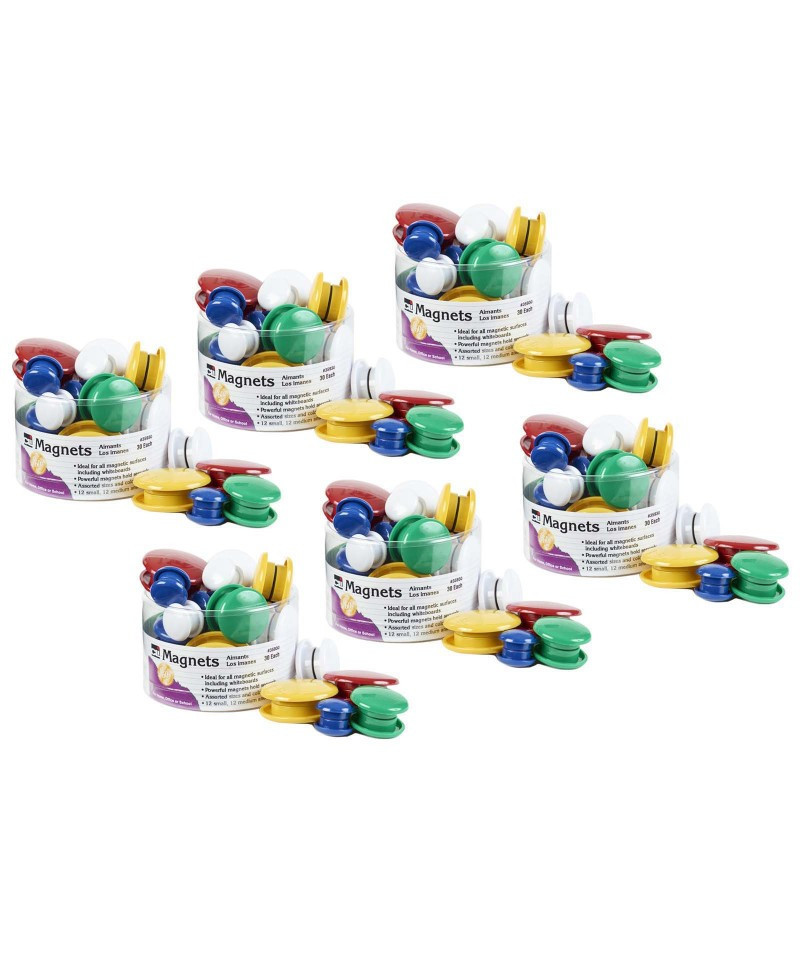 These colorful, strong magnets work well on all magnetic surfaces. From filing cabinets, magnetic whiteboards to most metal surfaces. Powerful magnets hold securely. Assorted colors and sizes for extra organization. Each tub includes 12 small, 12 medium and 6 large magnets. Assorted colors include: blue, green, red, white and yellow. Sold as 6 packs for a total of 180 magnets.
