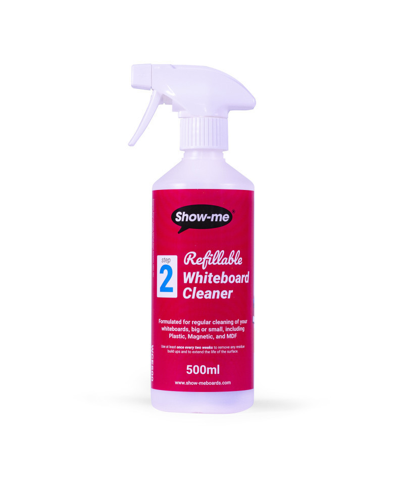 Keep your dry erase lapboards spotless and go super green with the Show-me Refillable Dry Erase Board Cleaner Starter Kit. This eco-conscious solution is designed to reduce waste and simplify board maintenance. The kit includes a refillable spray bottle and one cleaning sachet—just add warm water, shake, and you’re ready to clean. Perfect for regular use on all dry erase boards, including plastic, magnetic, and MDF surfaces, the cleaner helps extend the life of your boards when used every two weeks. The smart design reduces plastic use, cuts shipping weight, and eliminates the risk of leakage during transit or storage. Plus, the compact sachets are easy to store, saving space in your classroom or office. When you're ready to refill, simply purchase additional sachets (search code: WCE500R6) and keep cleaning sustainably. Pack of 6.