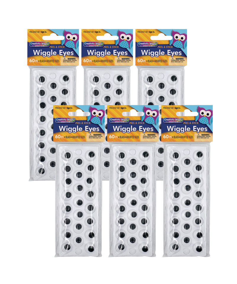 Bring projects to life with Creativity Street® Wiggle Eyes! These convenient Peel and Stick Wiggle Eyes are easy to adhere to different surfaces. Includes 60 black eyes in three sizes: 23 pieces of 15 mm, 20 pieces of 18 mm, and 17 pieces of 20 mm eyes. Ideal for the classroom, art room, daycare, or home. Sold as 6 packs for a total of 360 wiggle eyes.