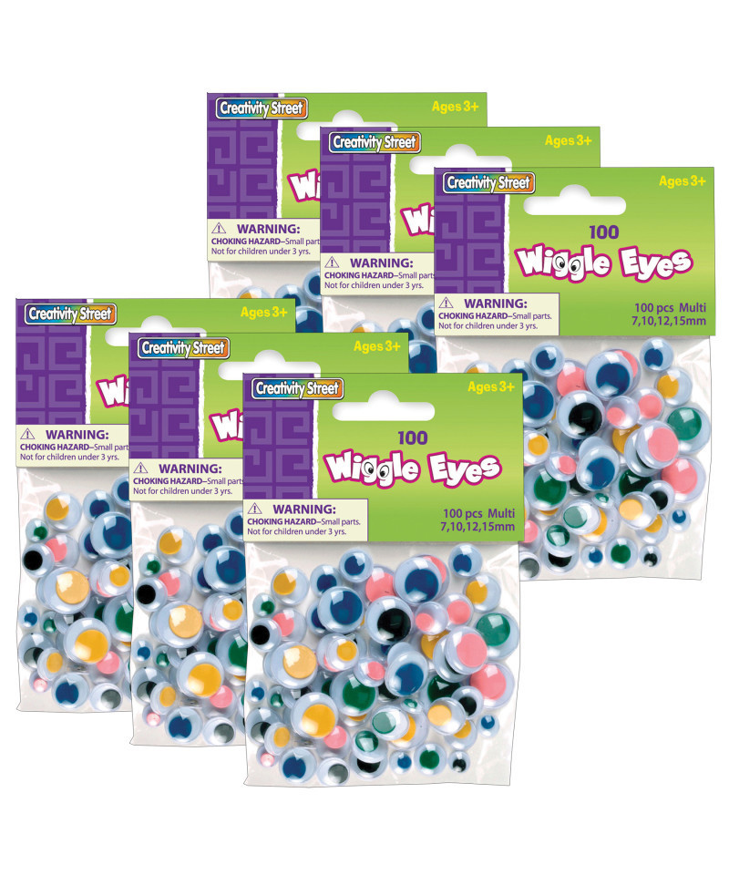 Wiggle Eyes bring projects to life! These multi-color eyes come in an assortment of sizes, and accept several types of glues and tapes to adhere to any project. Sizes include 25 each of 7 mm, 10 mm, 12 mm, and 15 mm. Ideal for the classroom, art room, daycare, or home. Each pack includes 100 pieces. Sold as 6 packs for a total of 600 wiggle eyes.