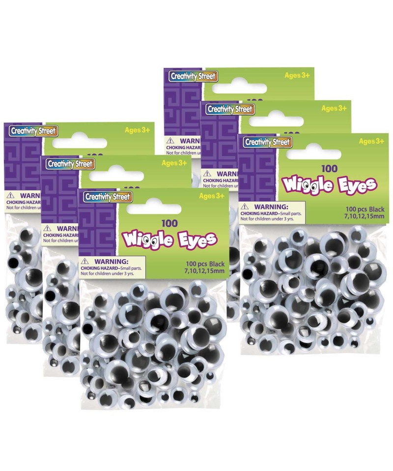 Wiggle Eyes bring projects to life! These black wiggle eyes come in an assortment of sizes, and accept several types of glues and tapes to adhere to any project. Sizes include 25 each of 7 mm, 10 mm, 12 mm, and 15 mm. Ideal for the classroom, art room, daycare, or home. Each pack includes 100 pieces. Sold as 6 packs, 600 pieces total.