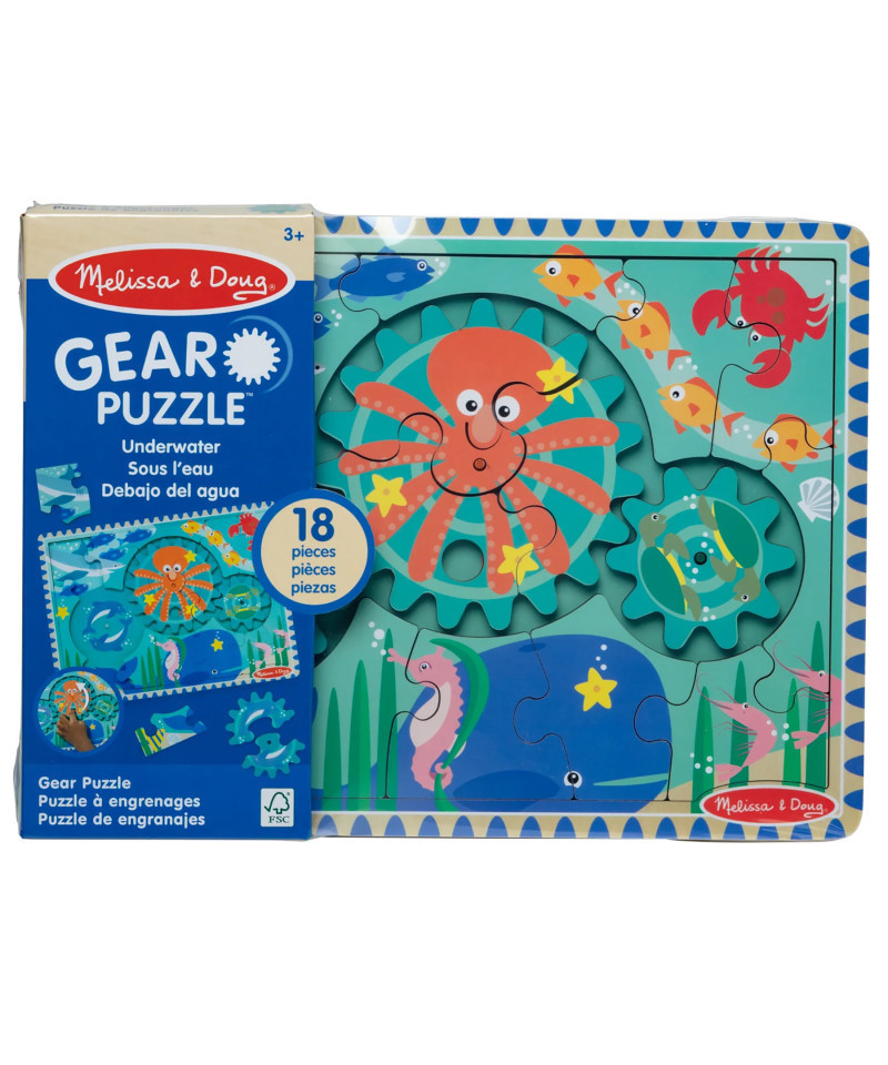 Piece together 18 wooden pieces to create a colorful underwater scene and a puzzle that moves! With this innovative and unique puzzle, pieces fit over pegs in the wooden puzzle board to create three interlocking gears that spin when the puzzle is complete. Artwork depicting an engaging ocean scene is on the puzzle board for easy matching. Vibrant colors and a variety of sea creatures encourage counting and color recognition, and the gears are great for fine motor development and for teaching cause and effect. Puzzle play helps to promote logical thinking, goal setting, and patience. The Melissa & Doug Wooden Underwater Gear Puzzle is an engaging, hands-on, screen-free activity for kids three and older.