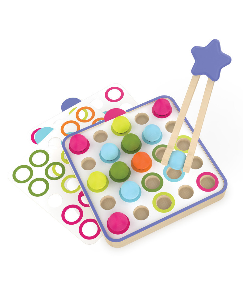 Use the Easy Tweezies wooden squeezers to arrange spheres to match the pattern cards—or make your own design! This set combines color matching, patterning, sequencing, planning, and fine motor skills all into one. The included activity guide comes with bonus ways to play and teaching instructions. Includes wooden frame board, five double-sided pattern cards, 25 wooden spheres, Easy Tweezies wooden squeezers, and activity guide.