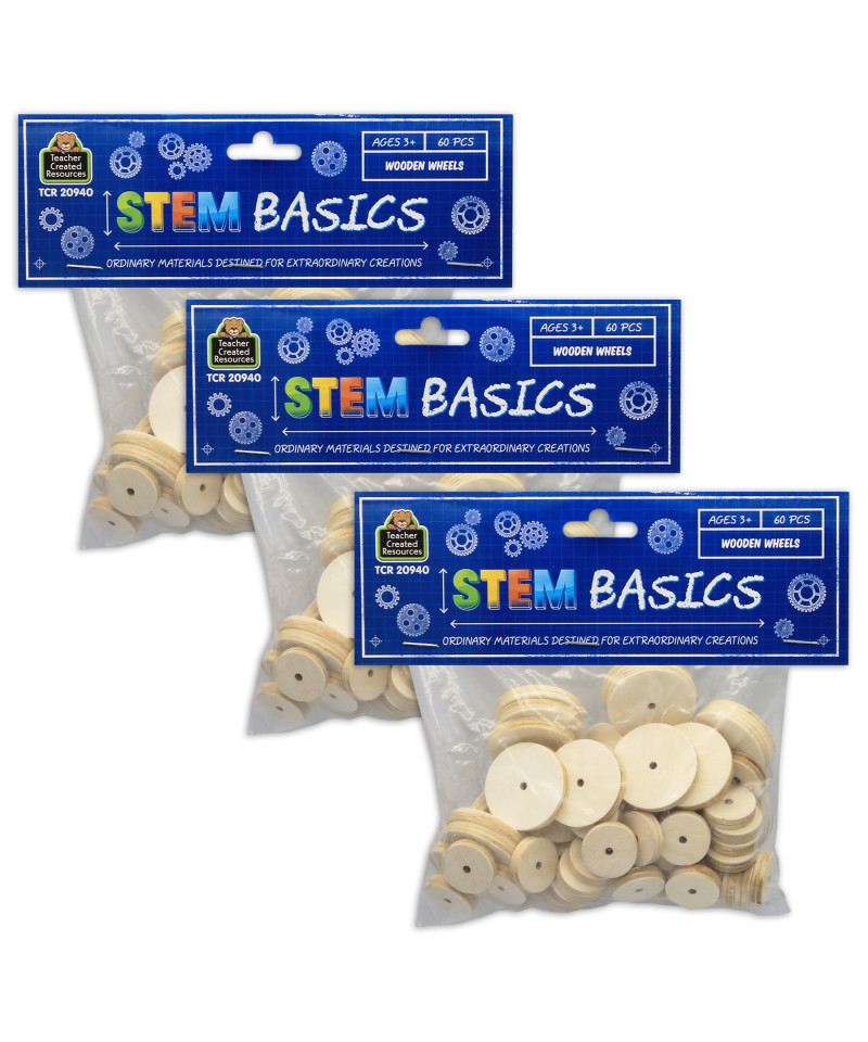 Wooden Wheels are everyday items that provide you with the basic materials that you need to build your next STEM creation. We provide the "basics," but the rest is up to you, your creativity, and your STEM skills. Use STEM Basics to support your favorite STEM Starters Kit, or design and construct a STEM challenge of your own! Measures 1.25" x 0.25" and 0.75" x 0.25". Each pack includes 60 pieces. Sold as 3 packs for a total of 180 pieces. Ages 3+.