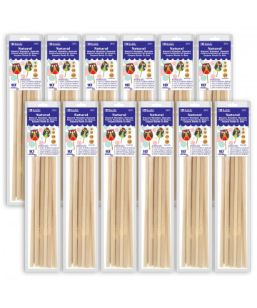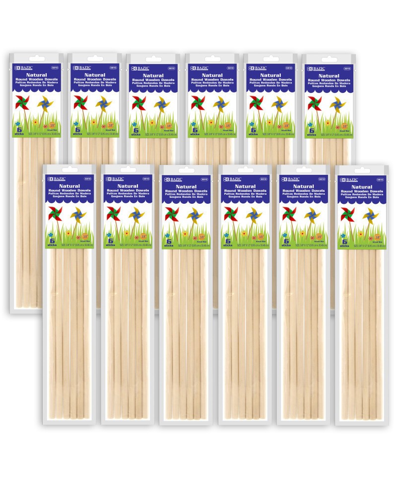These 3/8" x 12" round wooden dowels are made from white Baltic birch, and come pre-sanded and smooth. Safe, clean, unblemished wood craft sticks are great for DIY projects. Ideal for wedding cake layer support, and sharpens easily with pencil sharpener for insertion. Must have tools for homemade desserts like candy, lollipops, cake pops, birthday cakes. These high-quality wooden dowel rods are perfect for dollhouses, making wood toys, detailed wood crafts, model building, kids crafts, home decor, and much more. Each hardwood dowel rod is completely sanded and smoothed down during production so the hard work is already done for you. They are safe for kids and school use. Great teacher supplies in the classroom for a puppet show, flags, wedding props, photo props, kids crafts, handmade gifts. Each pack includes 6 dowels. Sold as 12 packs for a total of 72 dowels.