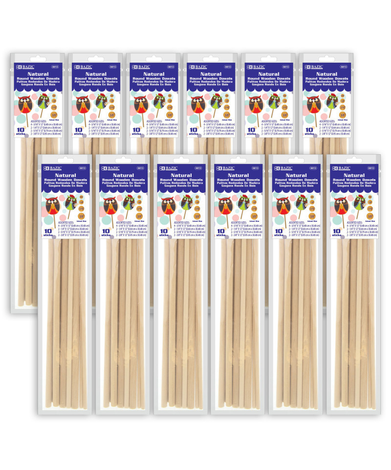 These assorted diameter, 12" long round wooden dowels are made from white Baltic birch, and come pre-sanded and smooth. Safe, clean, unblemished wood craft sticks are great for DIY projects. Ideal for wedding cake layer support, and sharpens easily with pencil sharpener for insertion. Must have tools for homemade desserts like candy, lollipops, cake pops, birthday cakes. These high-quality wooden dowel rods are perfect for dollhouses, making wood toys, detailed wood crafts, model building, kids crafts, home decor, and much more. Each hardwood dowel rod is completely sanded and smoothed down during production so the hard work is already done for you. They are safe for kids and school use. Great teacher supplies in the classroom for a puppet show, flags, wedding props, photo props, kids crafts, handmade gifts. Each pack includes 10 dowels: 4 pieces of 3/16" x 12", 2 pieces of 1/4" x 12", 2 pieces of 5/16" x 12", and 2 pieces of 3/8" x 12". Sold as 12 packs for a total of 120 dowels.