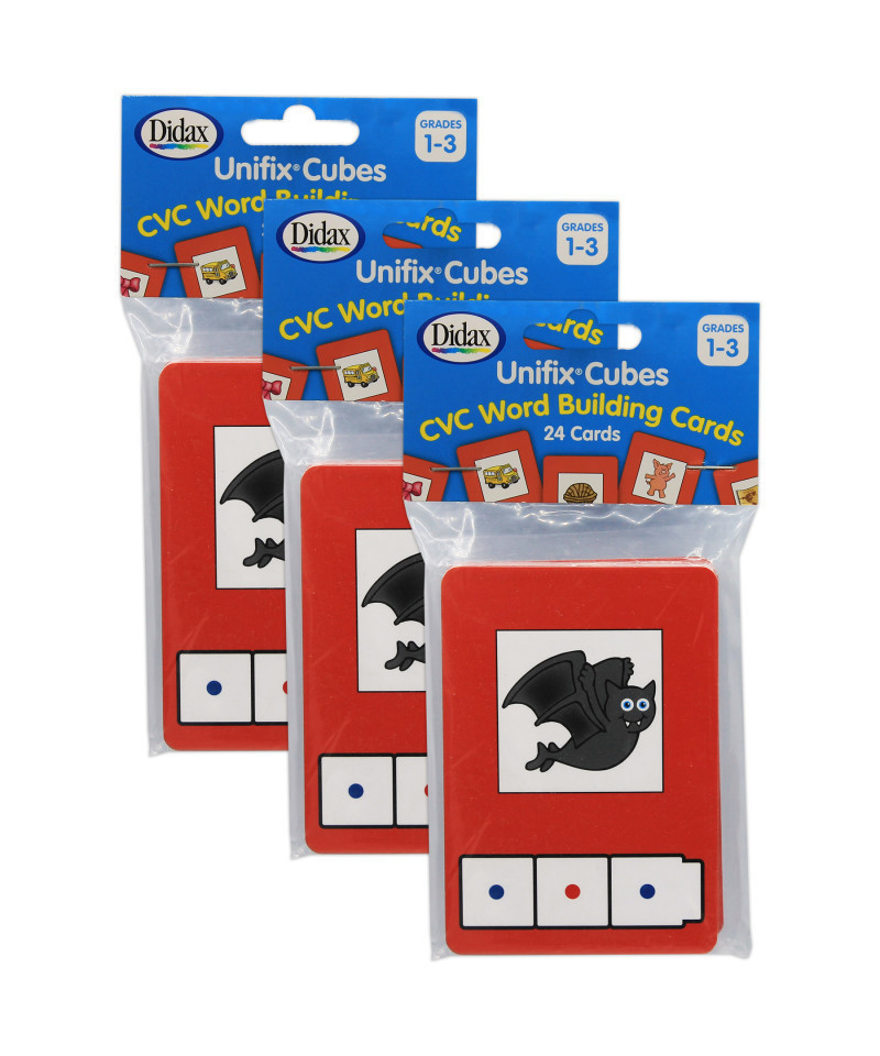 Set of laminated cards with picture and color cues for children to build three-letter words with Unifix Letter Cubes CVC sets. Color illustrations of common objects and animals. Use with Unifix Letter Cubes (sold separately). Each pack includes 24 cards. Sold as 3 packs for a total of 72 cards.