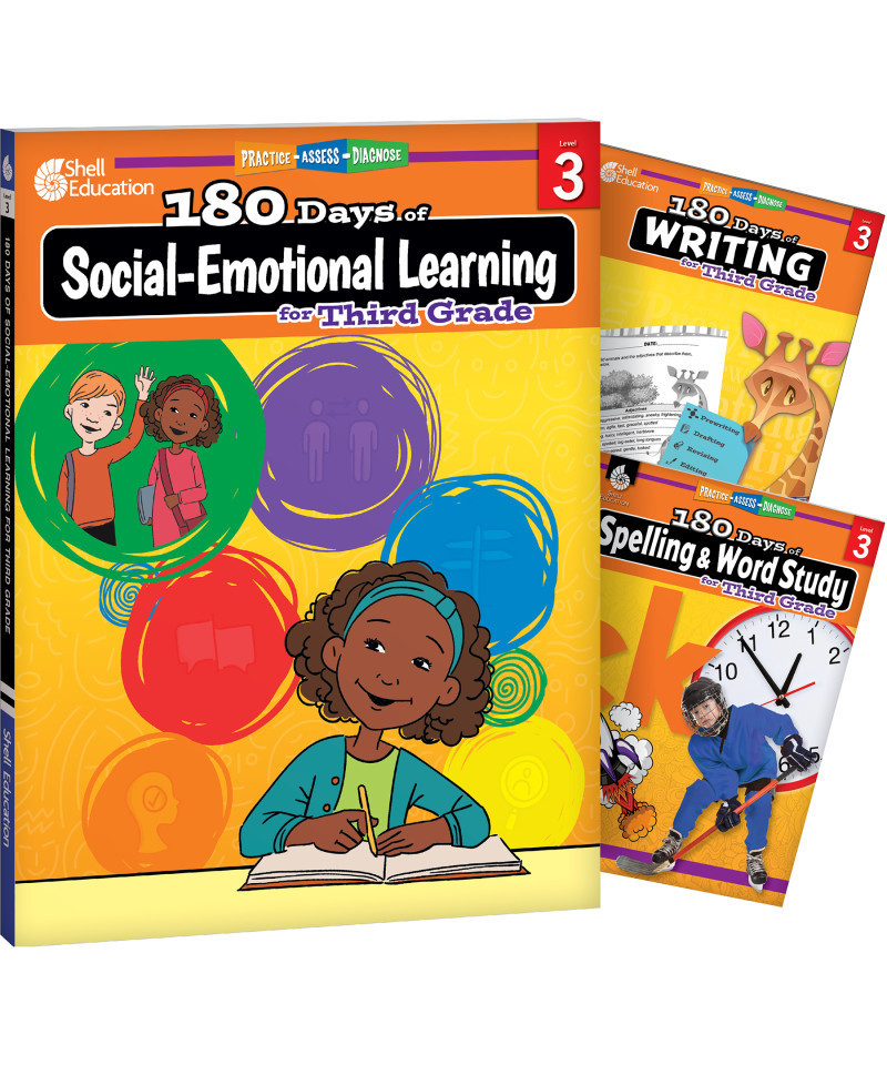 Shell Education 180 Days Social-Emotional Learning, Writing, & Spelling Grade 3: 3-Book Set