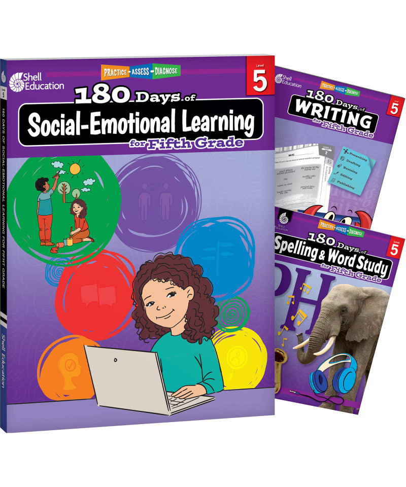 Shell Education 180 Days Social-Emotional Learning, Writing, & Spelling Grade 5: 3-Book Set