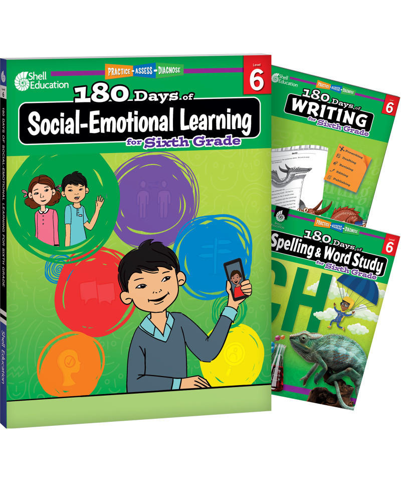 Shell Education 180 Days Social-Emotional Learning, Writing, & Spelling Grade 6: 3-Book Set
